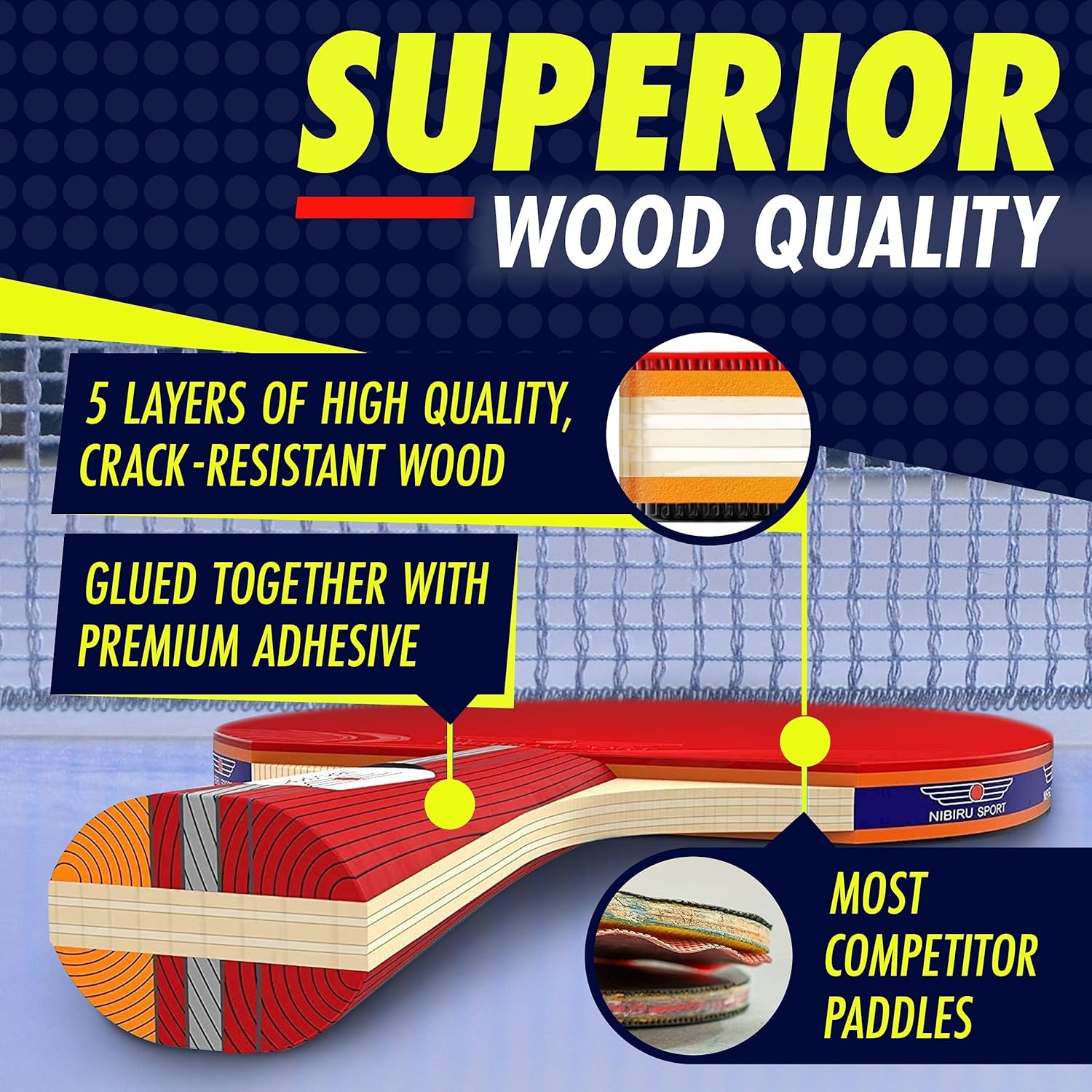 - QUALITY MATERIALS - Each ping pong racket consists of 5 layers of high-quality crack-resistant wood. The flared ping pong paddle handle fits most palms smoothly for a great, sweat-free grip.