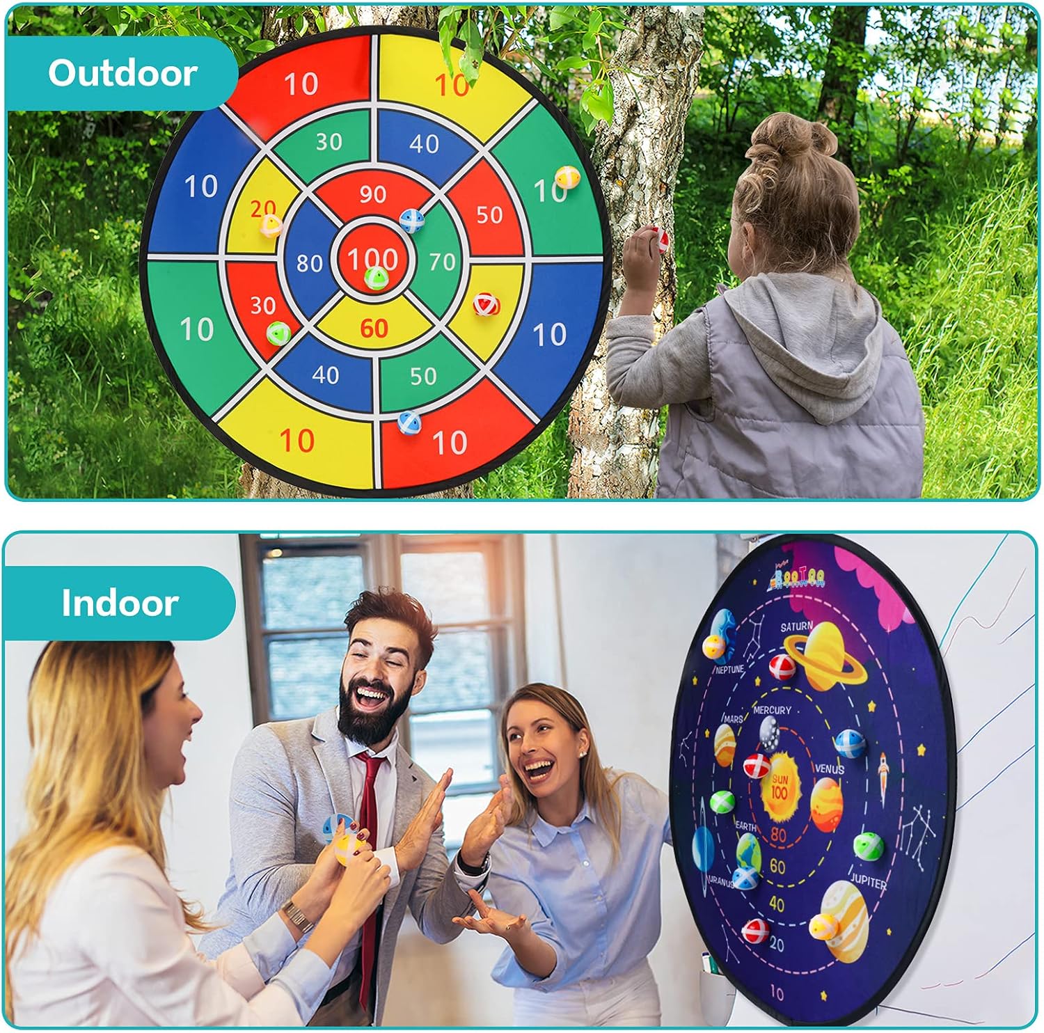 - ENJOY DART BOARD GAME INDOOR/ OUTDOOR/ SCHOOL, FOR ALL AGE --- Play this funny dart games wherever you want. Enjoy happy time with friends/ students/ parents in living room, lawn, backyard or anywhere inside and outside at Christmas party, or daily. Perfect for kids/ boys/ girls/ adult birthday party, family, class party, indoor outdoor activity. Not only for kids, the whole family can enjoy the happy hours. Helps promote parent-child relationships. It's a funny toy for all ages.