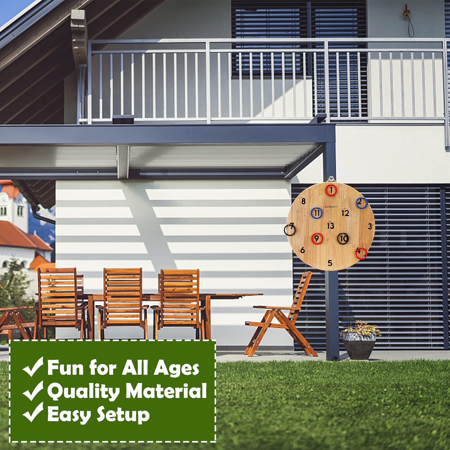 - GIANT FUN FOR ALL AGES - 20-inch SUNGIFT giant ring toss game for adults and kids, improves hand-eye coordination & math skills. Provides hours of entertainment and education for the whole family. Whether alone or playing with family and friends, this hook ring toss can provide hours of fun.
