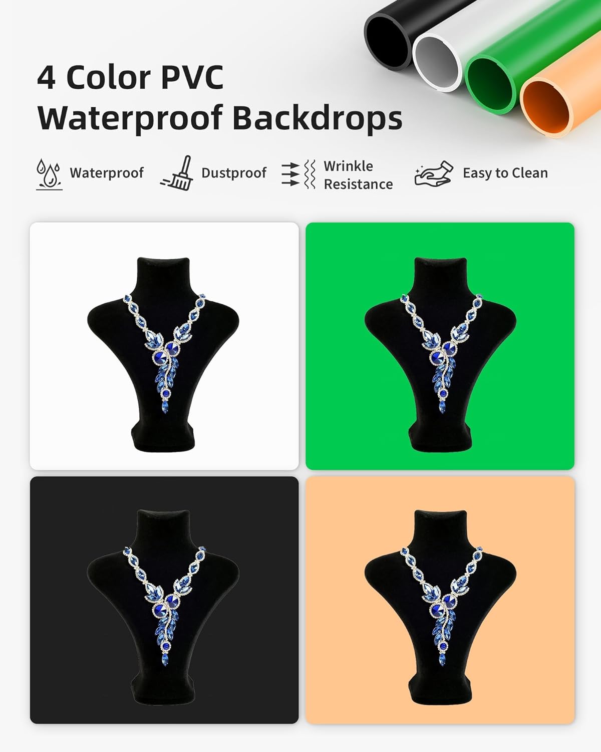 - 【4 Color PVC Backdrops】 Transform your product photos with 4 detachable PVC backdrops in different colors (White/Black/Orange/Green). They're made of high-quality, wrinkle-free PVC, so you can effortlessly switch backgrounds and create captivating scenes that make your products pop.