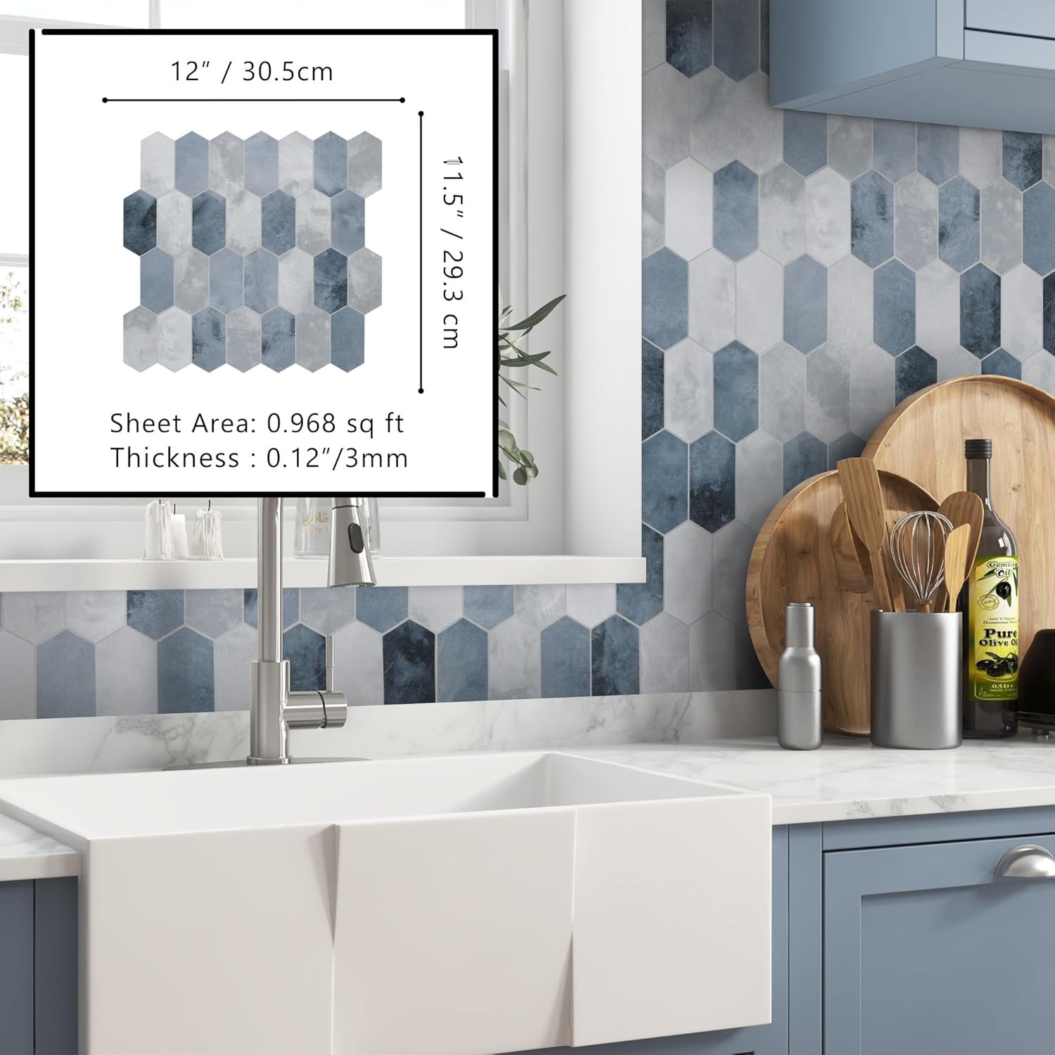 - Hexagon Tile: Crafted from durable stone composite, this tile offers a colorfast, scratch-resistant, and low-maintenance solution. With three stunning colors to choose from, This is a vibrant blue that makes the room look bigger and gives you a very soft van nue.12inch x 11.5inch x 0.12inch for each piece, 1pc=0.968 sq ft, 10pcs=9.68 sq ft,.*ATTENTION: Before installation, please make sure to measure the size and confirm the desired color upon receiving the items.