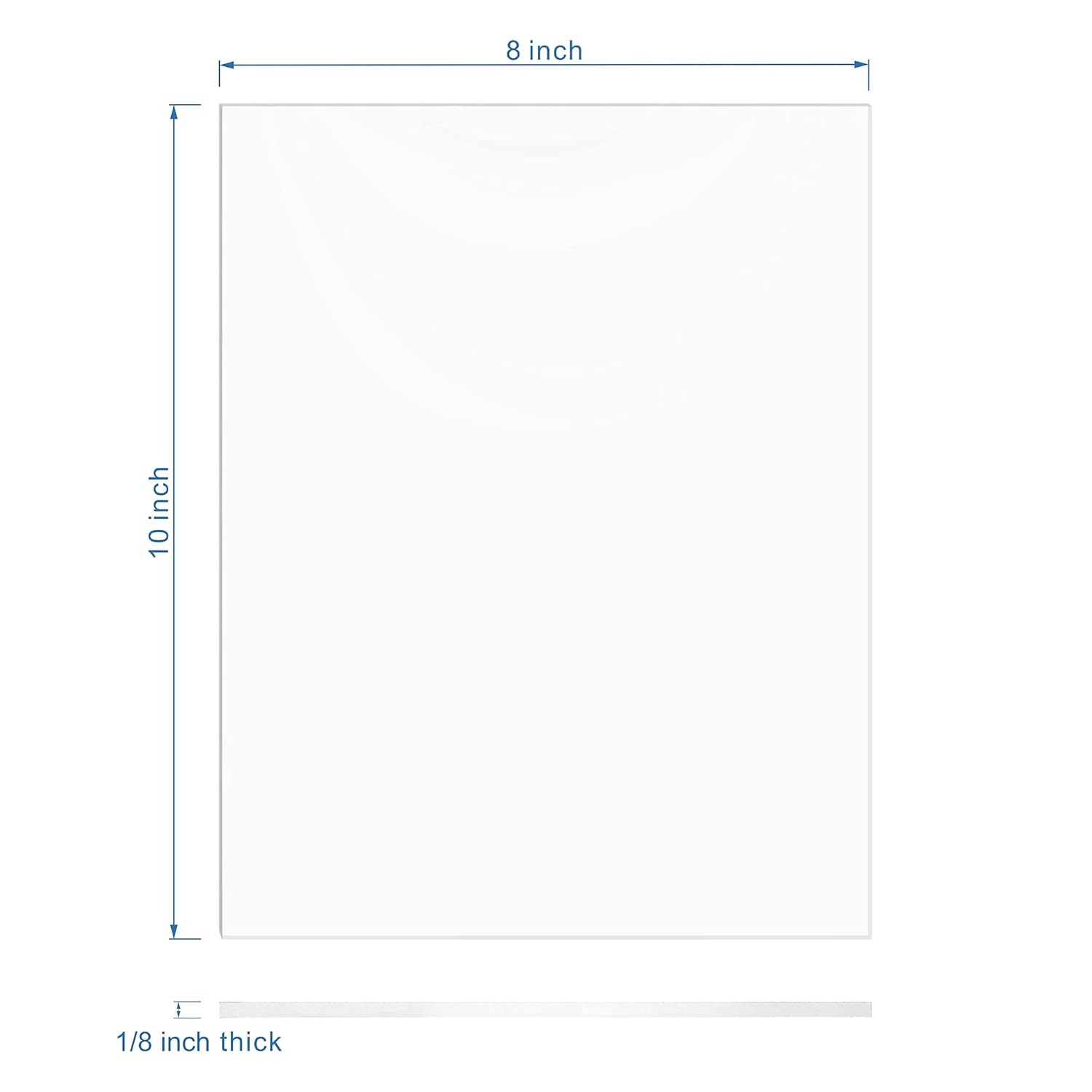 - It measures 8 x 10 inches with 1/8 inch thick (0.118" / 3mm nominal). Please remove the protective paper on both sides of the acrylic piece before use.