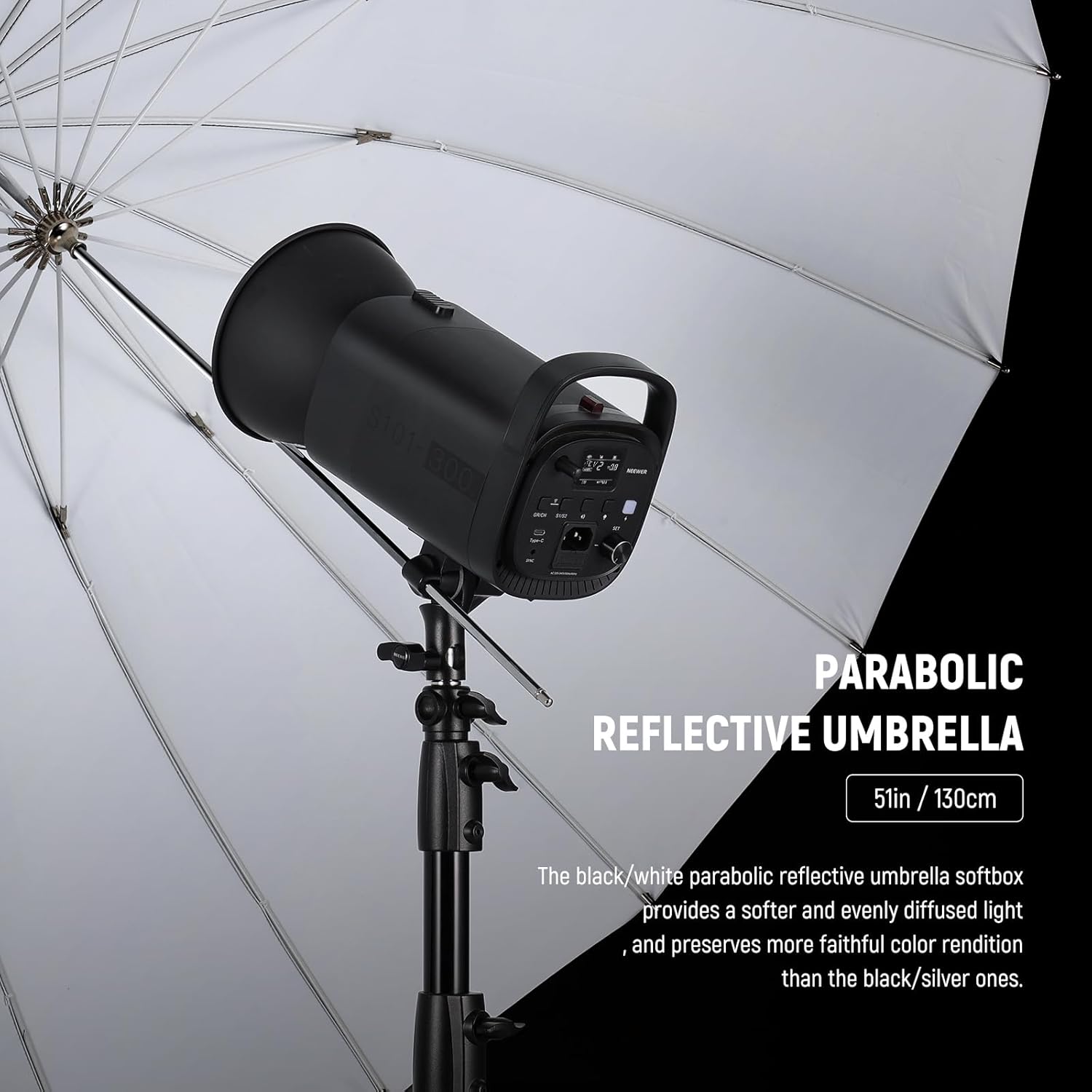 - 【51"/130cm Black/White Parabolic Reflective Umbrella】 This 51"/130cm deep parabolic umbrella softbox provides a softer and more evenly diffused light effect than the black/silver version, and preserves neutral color temperature for faithful color rendition. Perfect for group portraits or expansive landscapes. Its parabolic shapped design allow for a broader spread of light