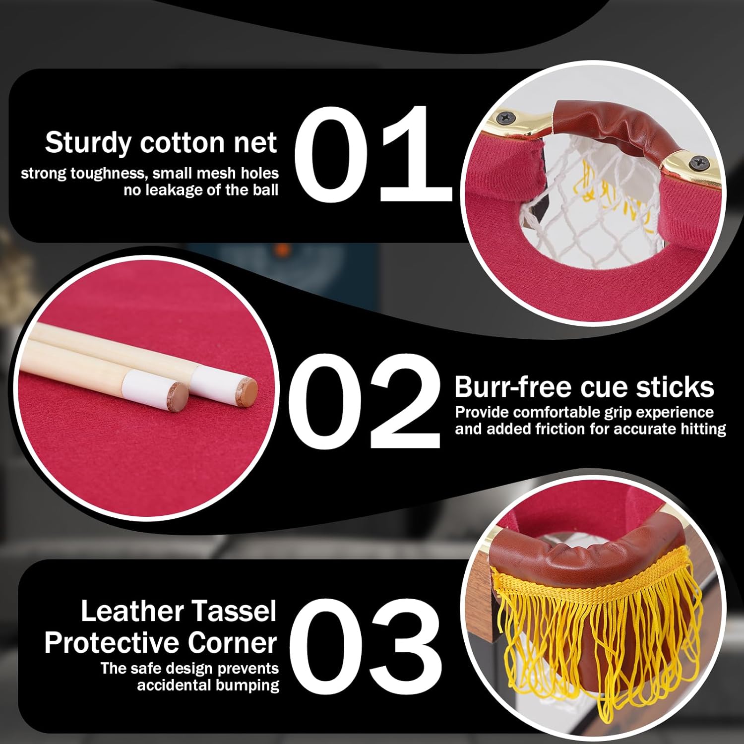 - 【SOPHISTICATED DESIGN】Our billiard table is very realistic, the surface is made of high-quality velvet cloth, delicate and smooth, good hitting feeling, high quality and durable mesh bag, strong toughness, small mesh holes, no leakage of the ball, leather pocket-proof flying ball design, giving you the best gaming experience!