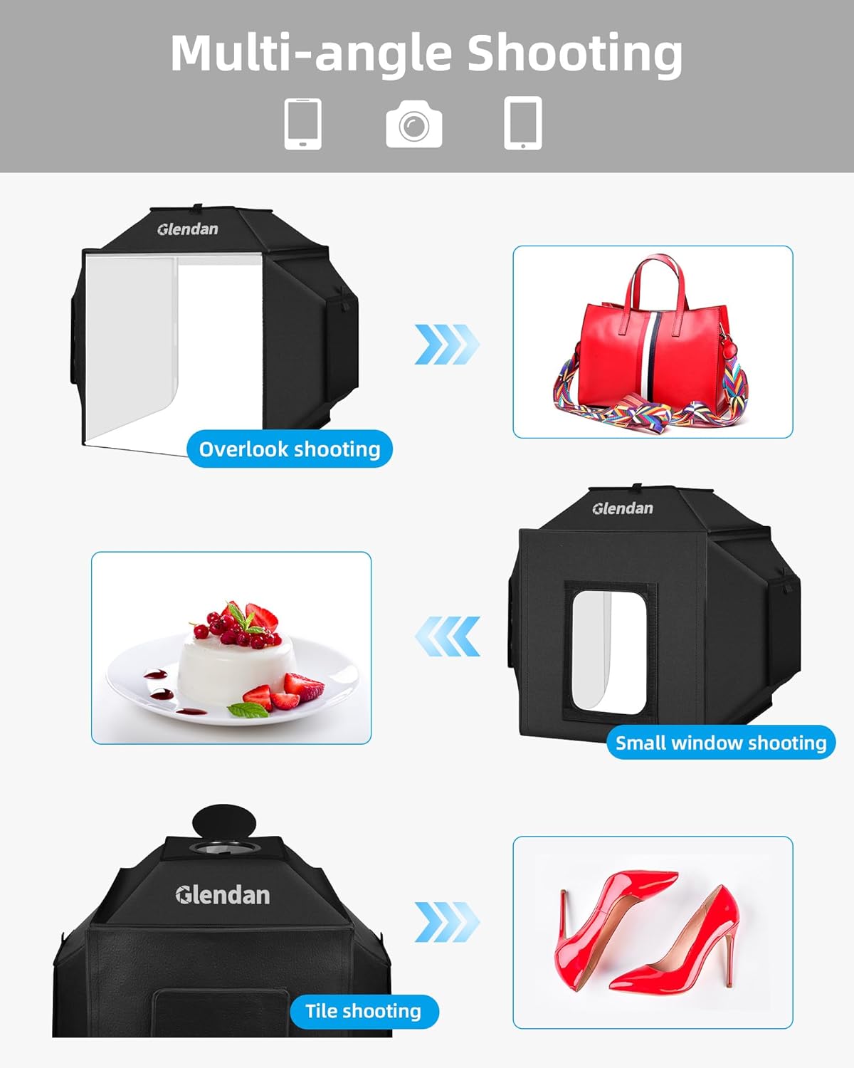 - 【Upgraded 3 Light Diffuser】No more worries about shadows ruining your shots! Glendan's light box has 3 light diffuser that soften the light, making it perfect for beginners and pros. Say goodbye to harsh lighting and hello to beautifully illuminated products. It's like having a professional studio and a softbox all in one.
