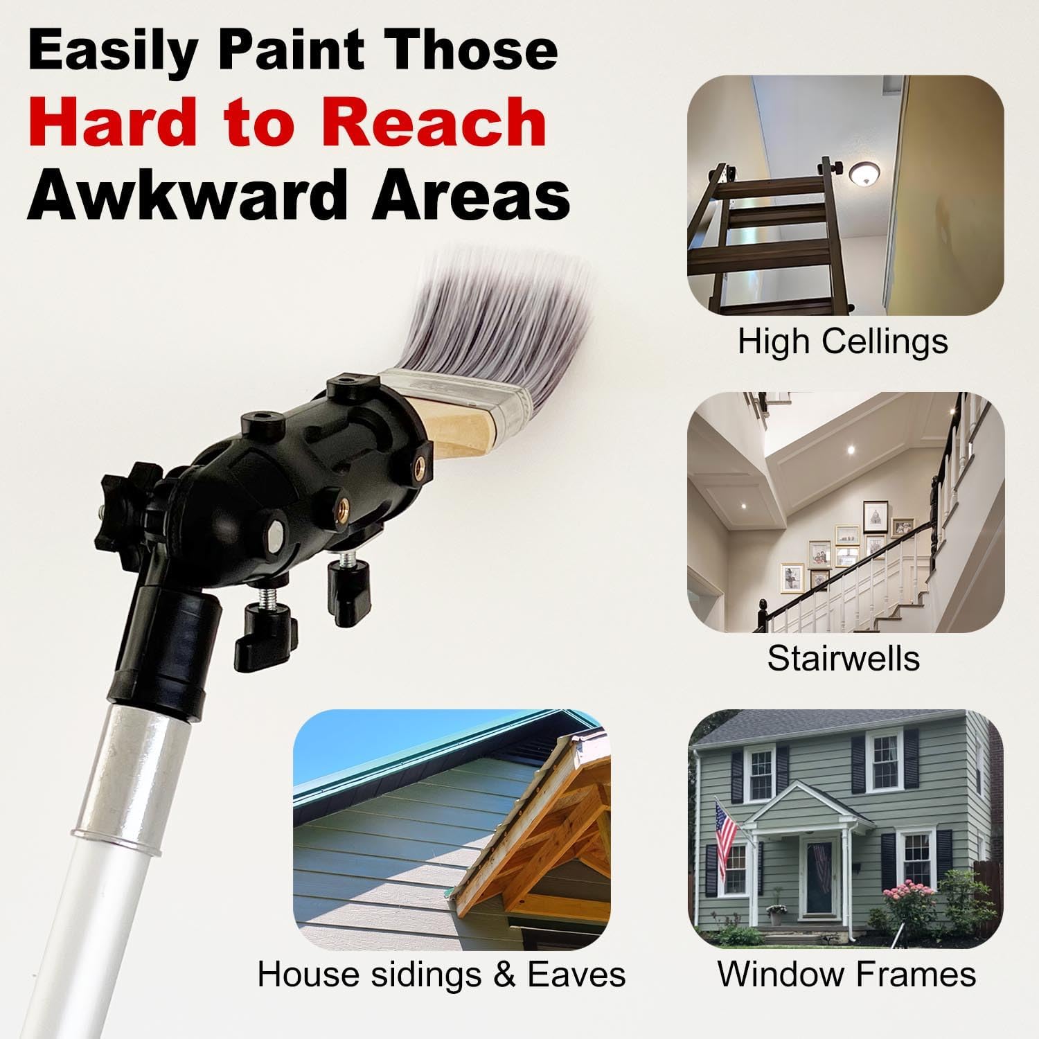 - Painting Hard-to-Reach Areas: Attach our paintbrush extender to your painting extension pole, converting standard brushes into long paint brushes to effortlessly access awkward spots like high ceilings, stairwells, eaves, frames, sidings, and narrow nooks.