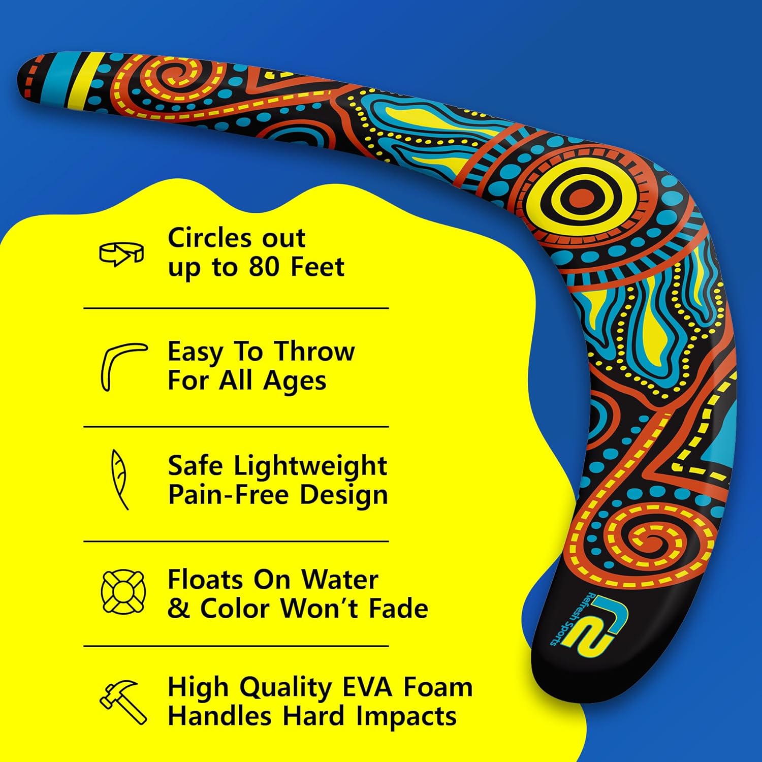• ๐—ก๐—ฒ๐˜„ & ๐—จ๐—ป๐—ถ๐—พ๐˜‚๐—ฒ ๐—˜๐—ฉ๐—” ๐—™๐—ผ๐—ฎ๐—บ ๐——๐—ฒ๐˜€๐—ถ๐—ด๐—ป - The Boomerang is back! Our Boomerangs set the standard with a unique EVA (Ethylene-Vinyl Acetate Copolymer) Foam not seen elsewhere. Recognized for its durability in sports protection padding and gym tile flooring, this foam ensures strength against wear and tear, hard impacts, and water damage. This isn't just another traditional wooden Boomerang; it's made to easily fly back to you and not hurt your fingers when you catch it.