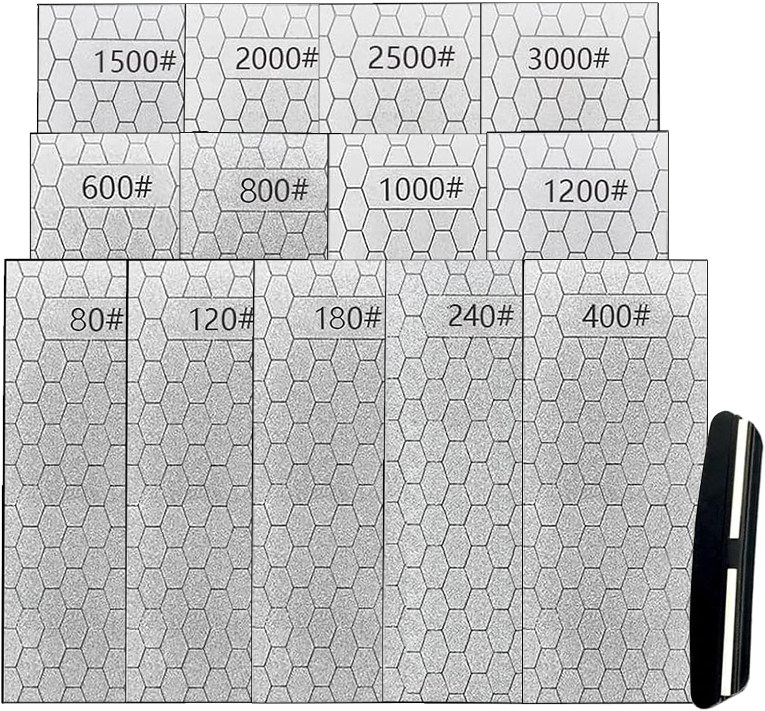 - 13 DIAMOND SHARPENING PLATE: 13 pieces grinding stones with anti slip base,made of durable diamond material. They respectively are 80+120+180+240+400+600+800+1000+1200+1500+2000+2500+3000 Grit