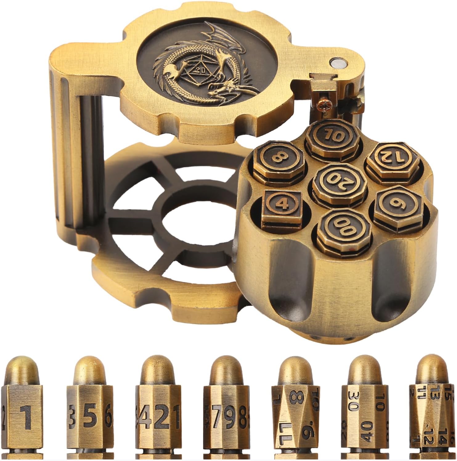 Bullet Dice, Revolver Bullet Metal Dice Set with Spinning Revolver Cylinder Container & Seven Polyhedron Dices for Sci-Fi, War, Crime Theme Tabletop Games