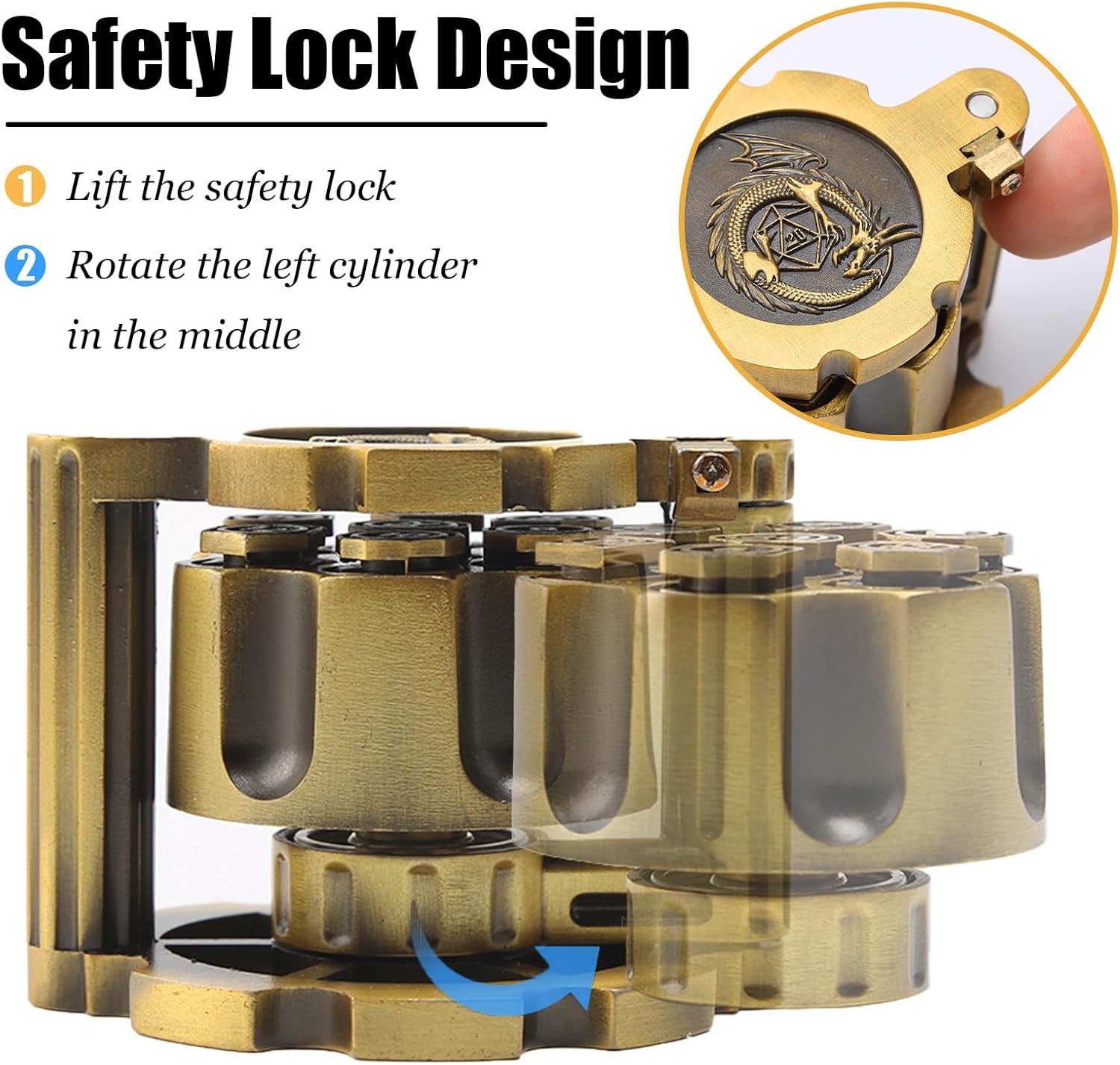 • REVOLVER CYLINDER DICE CONTAINER: Store your bullet dice securely in the spinning revolver cylinder dice case. This fun and functional revolver dice container not only keeps your bullet dice set safe but also serves as a great fidget toy to keep your hands busy during game lulls