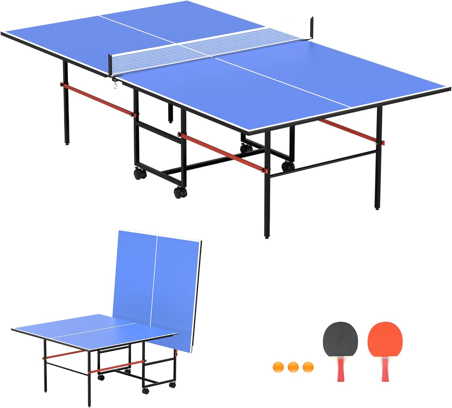 - Table Tennis Table Set: a ping pong table, net, 2 paddles, and 3 balls. This ping pong table set has a 2-piece foldable design. Easy to move and store, it is perfect for enjoying a game of table tennis without taking up too much space.
