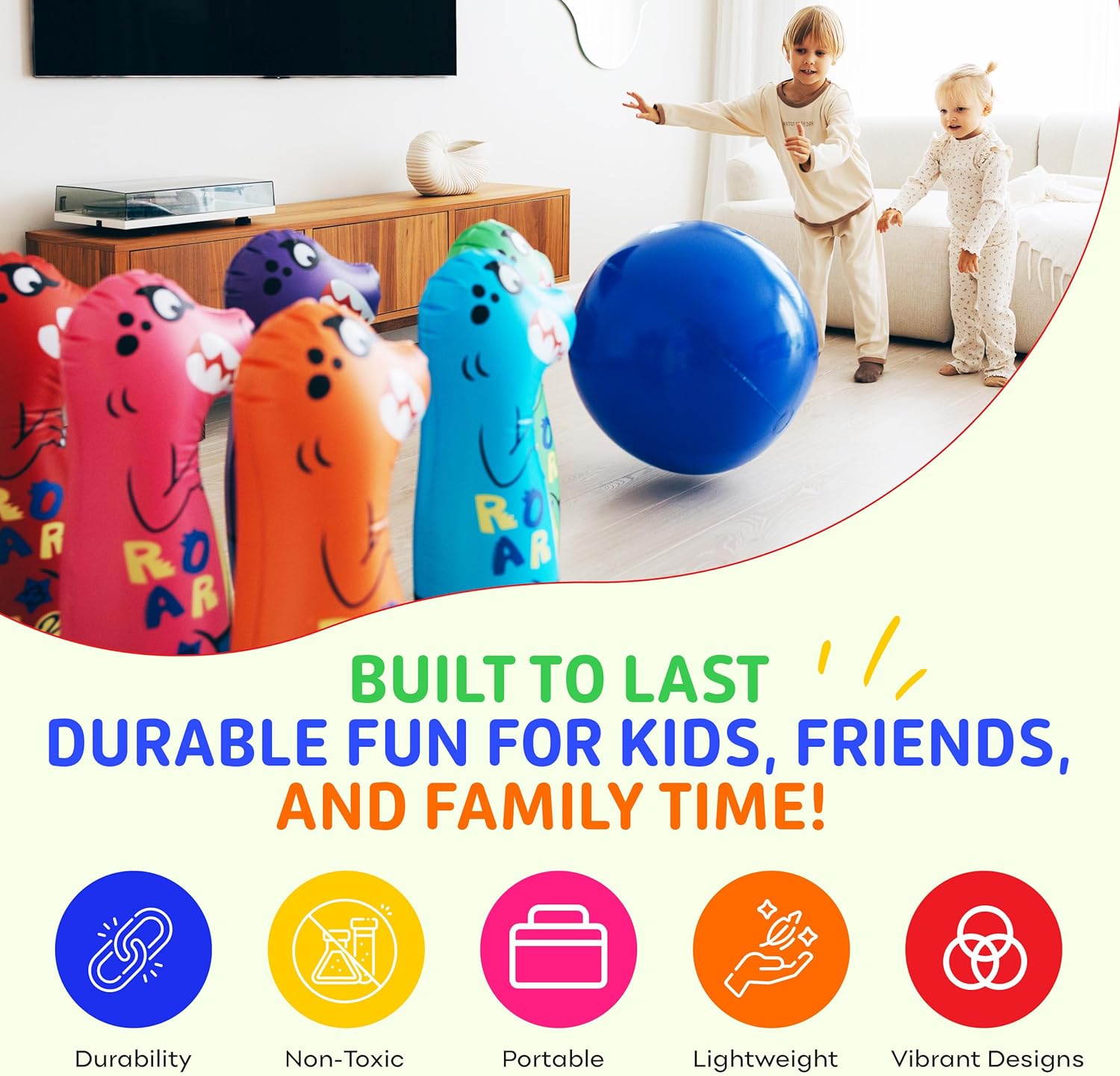 - ⦁ LIFE-SIZED DINOSAUR FUN: Featuring six vibrant 26” inflatable pins shaped like dinosaurs and pre-filled with sand for stability, this kids bowling set brings roaring fun and adventure to every game