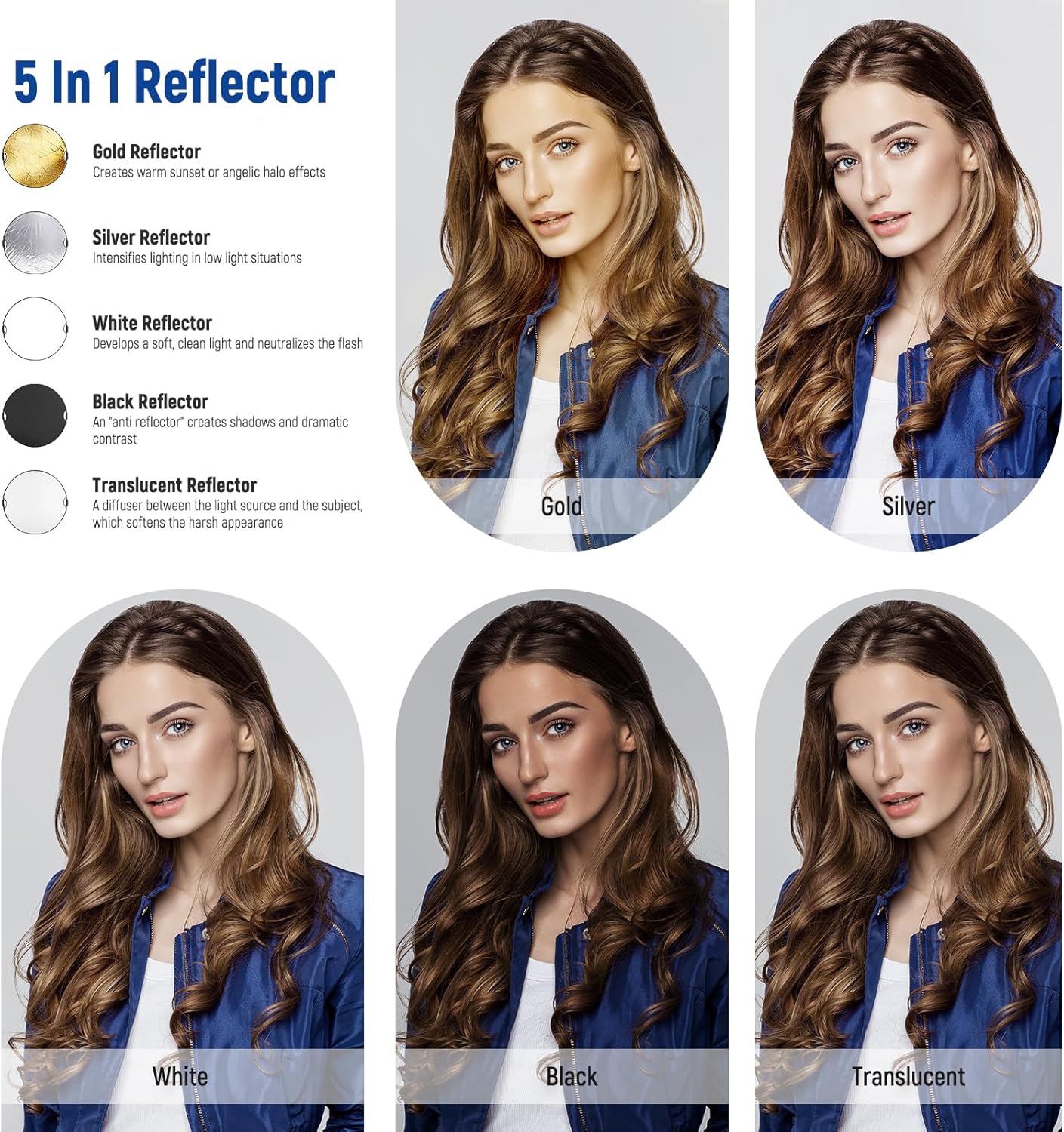 - 【Achieve Five Light Effects】 This 5 in 1 reflector kit offers you a round, translucent diffuser panel and a reversible sleeve that features four reflective surfaces, white, black, gold, and silver, ideal for bouncing lights with different tones