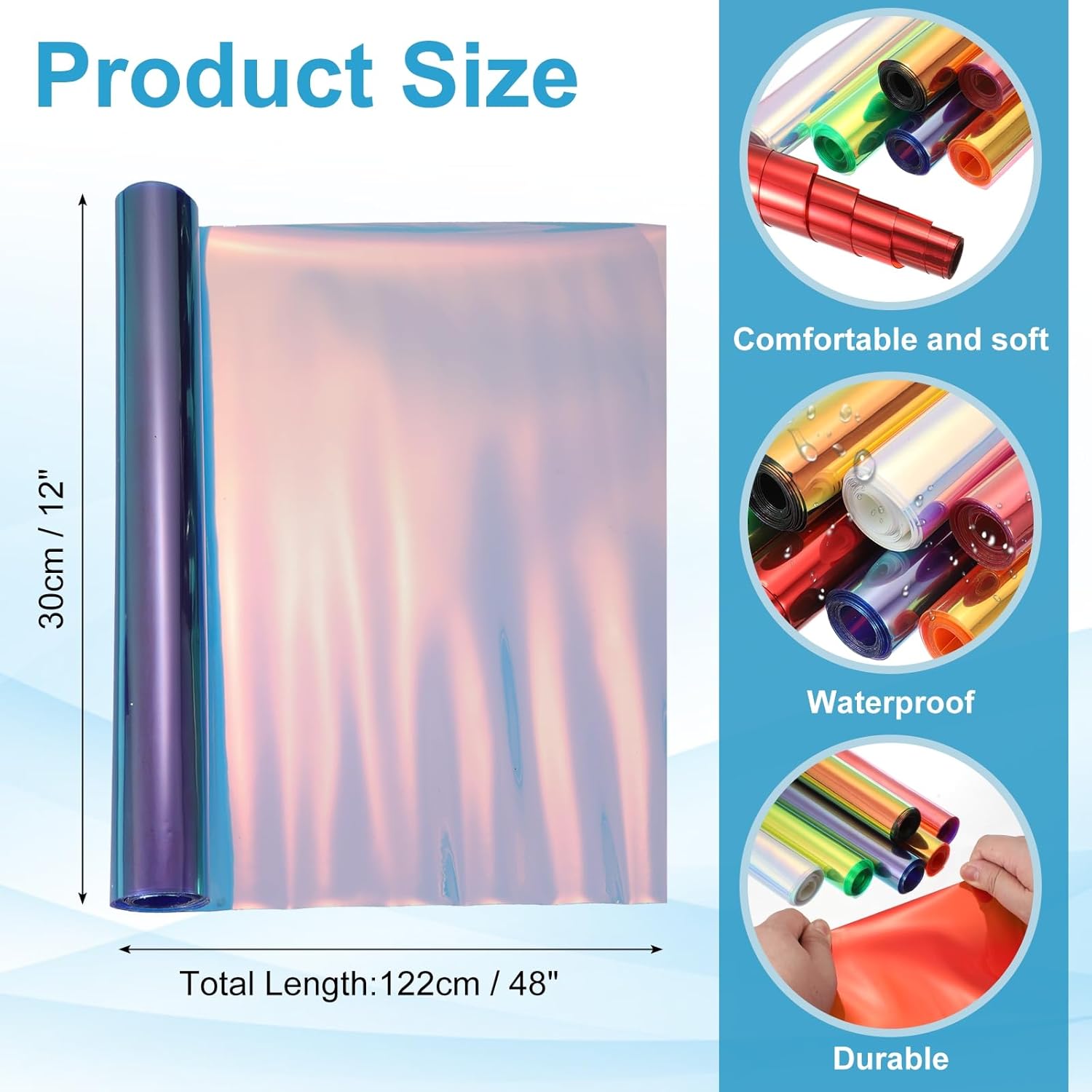 - Holographic Vinyl Faux Leather Sheets, Size:30cm x 122cm/12inch x 48inch,Color: Laser Blue,Material: PVC,In the package of: 1 x Transparent Vinyl Roll