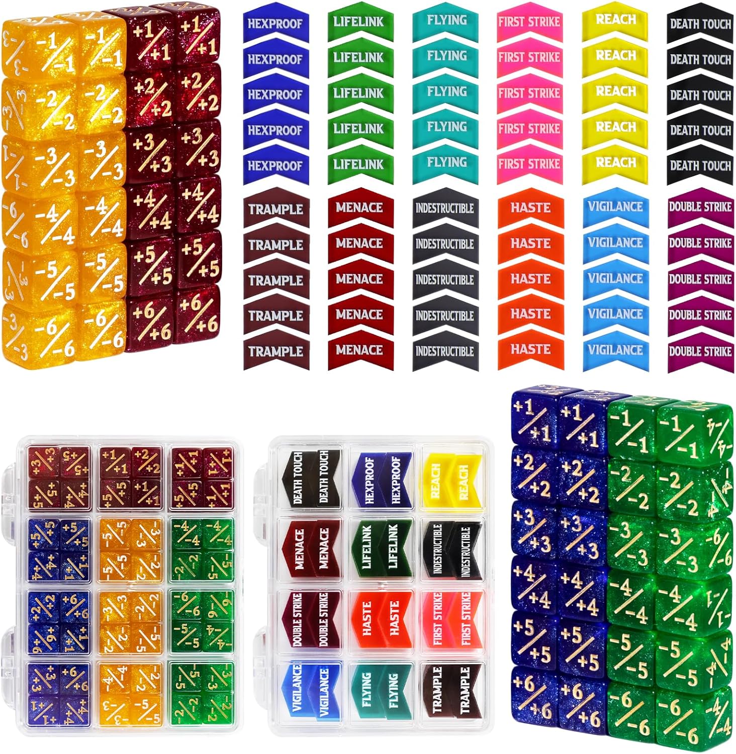 • PACKAGE INCLUDED - Comes with 60pcs MTG tokens & 48pcs 12mm MTG dice set. MTG tokens include 5x First Strike, 5x Double Strike, 5x Indestructible, 5x Hexproof, 5x Haste, 5x Reach, 5x Lifelink, 5x Deathtouch, 5x Menace, 5x Trample, 5x Flying, 5x Vigilance. Dices include 48pcs dice counters(24pcs -1~-6 & 24pcs +1~+6). Note: Product includes counters and dices only. The game cards are NOT INCLUDED in this product!