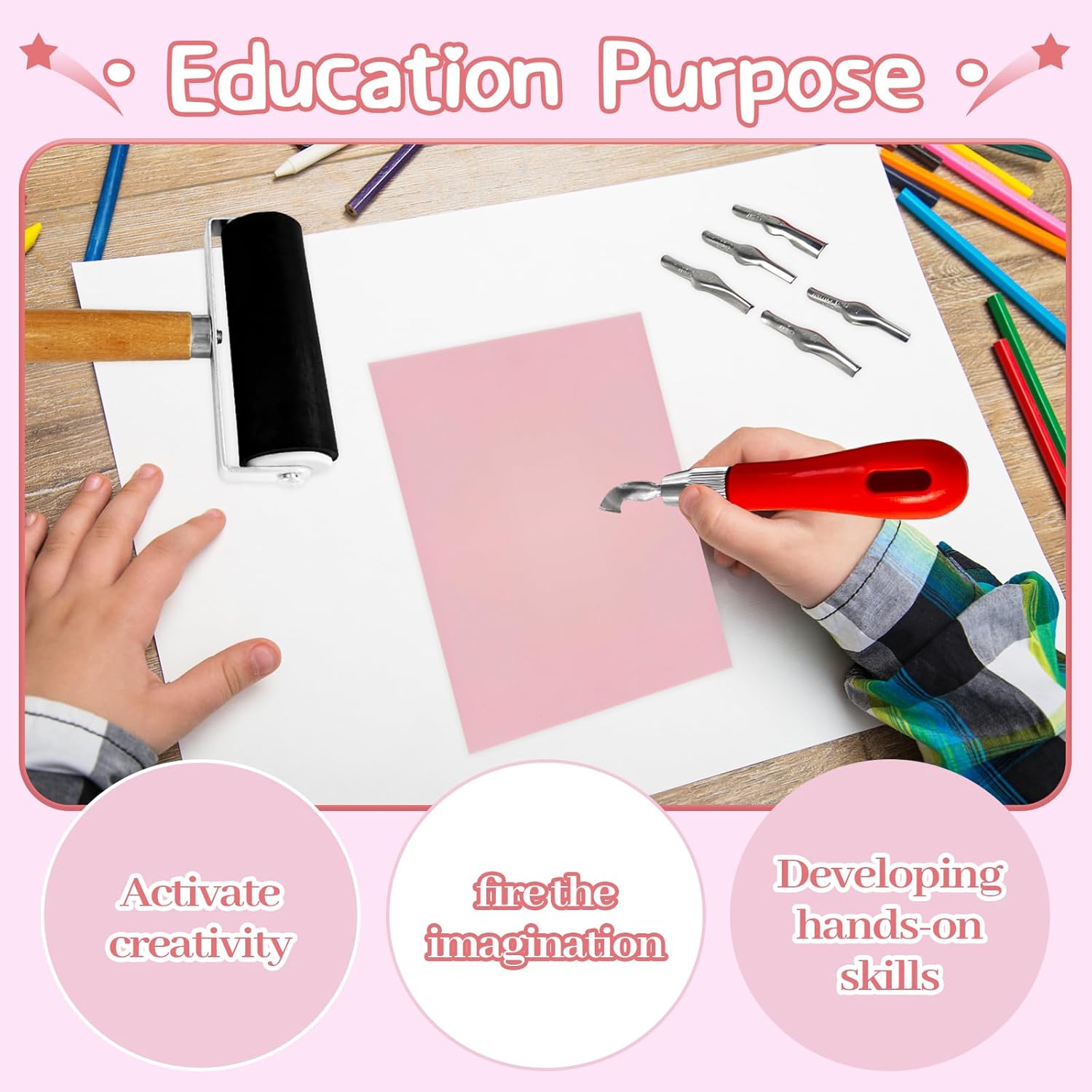 - Complete Set of Tools:The package includes 4 pink rubber blocks,a set of carving tools,and 1 rubber brake roller.These carving blocks are very suitable for beginners and professionals.Start your journey of carving and printing.