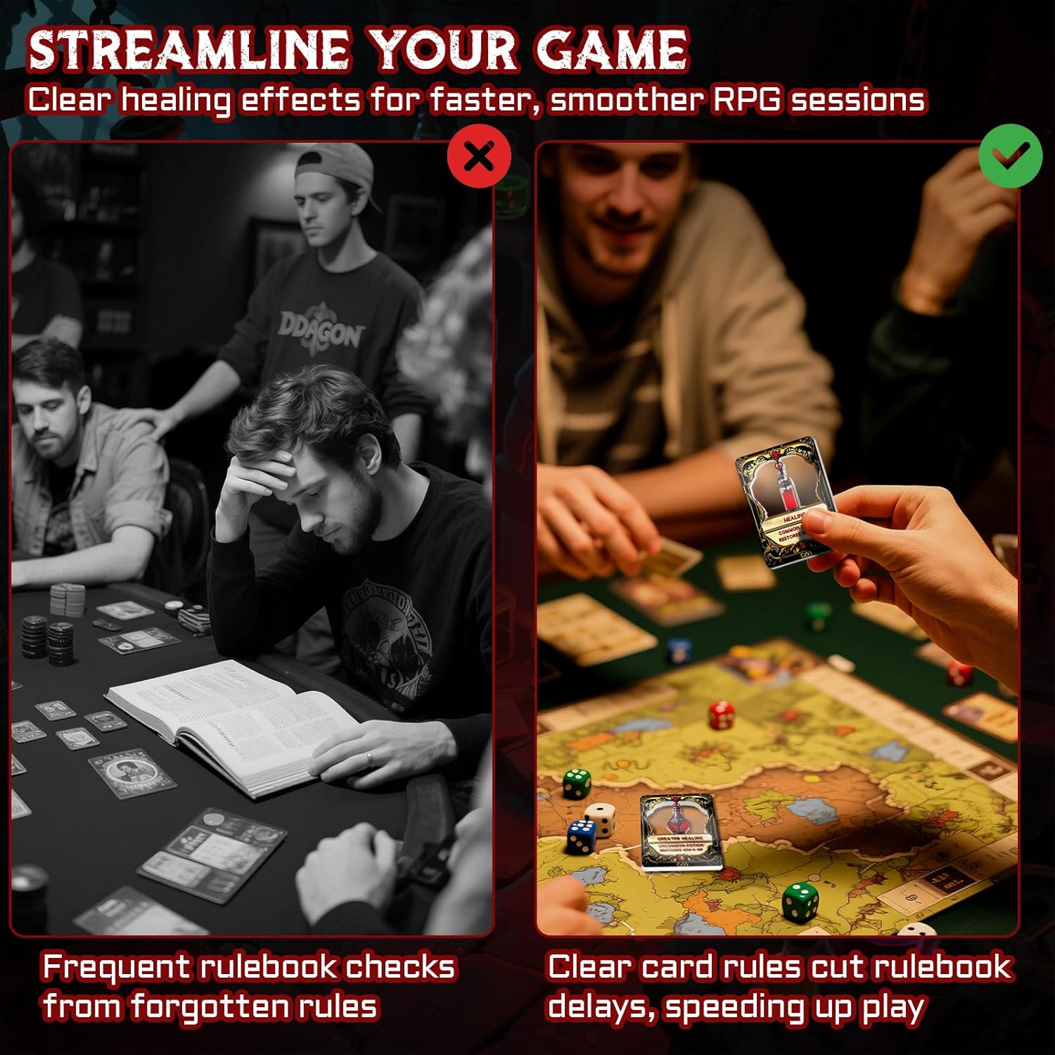 - SIMPLIFY GAME MANAGEMENT WITH INTERACTIVE TOKENS: Streamline your RPG sessions by using these interactive healing potion tokens. Ideal for Dungeon Masters, these acrylic potion cards feature clear, concise healing effects that help you manage game mechanics without flipping through rulebooks, saving time and enhancing gameplay flow.