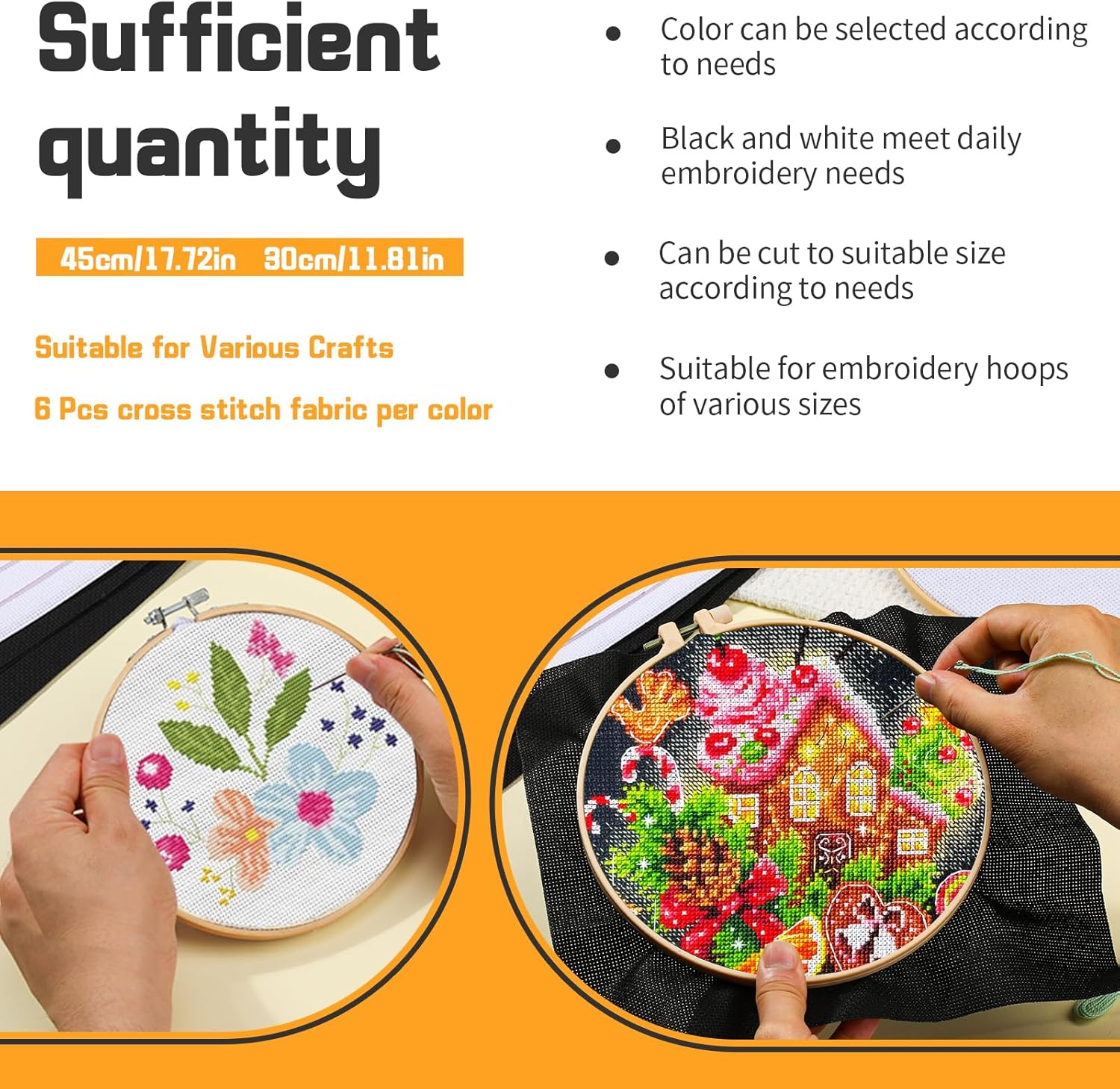 - Black and White Fabric: This cross stitch fabric comes in 2 colors, white and black. White is suitable for most cross stitch types, such as landscapes, cartoons, etc. The embroidery cloth has clear grids and is easy to cut and create embroidery projects. Black can be used to create some unique pattern embroidery, and the effect is also very good
