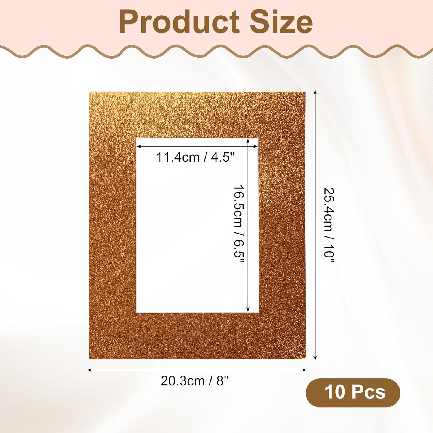 - [Picture Mats] Material: Cardboard; Color: Gold; Total Size: 20.3 x 25.4 cm / 8" x 10"; Bevel Cut Opening Size: 11.4 x 16.5 cm / 4.5" x 6.5"(L*W); Fit Picture Size: 5" x 7"; Package Content: 10 Pcs x Picture Mats