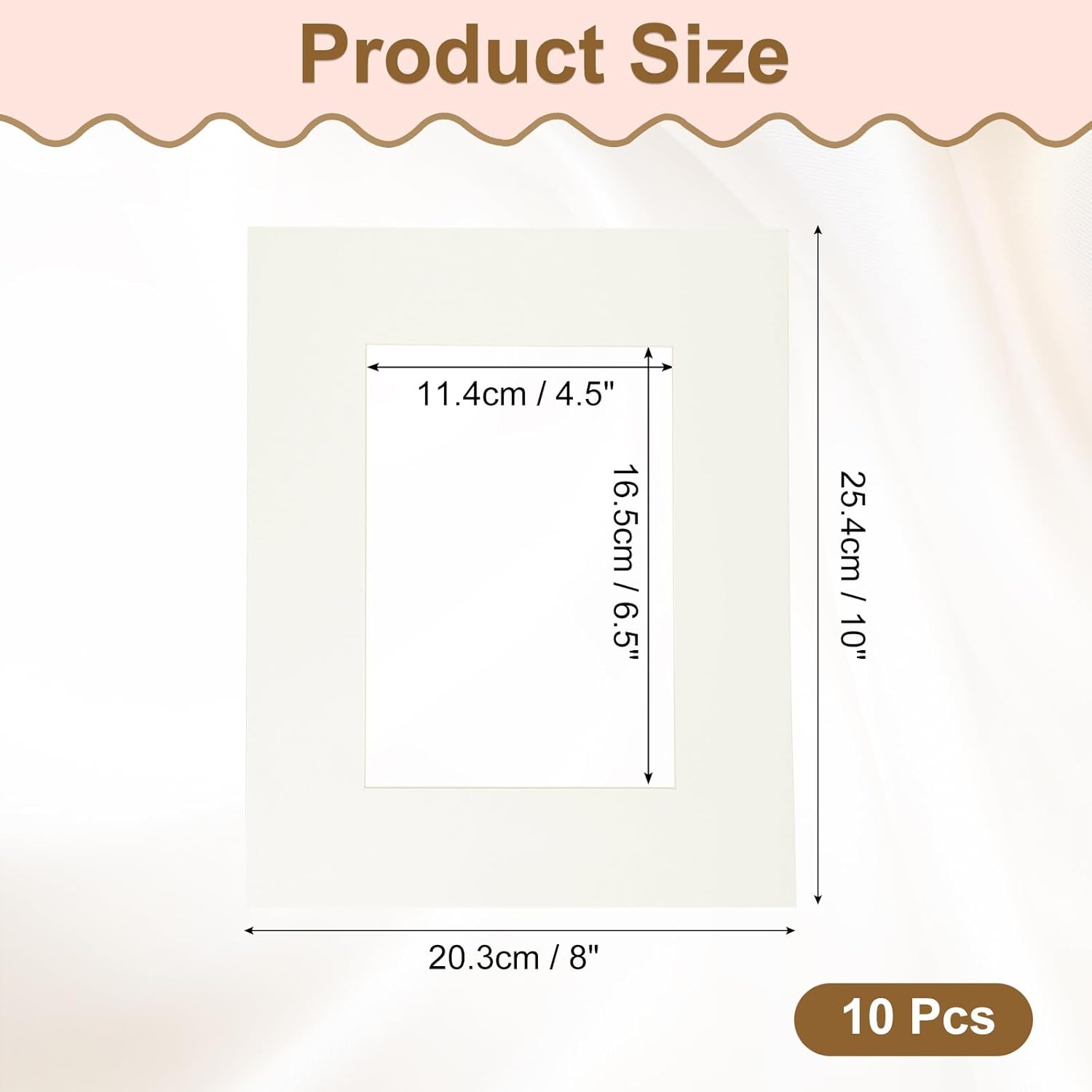 - [Picture Mats] Material: Cardboard; Color: Cream; Total Size: 20.3 x 25.4 cm / 8" x 10"; Bevel Cut Opening Size: 11.4 x 16.5 cm / 4.5" x 6.5"(L*W); Fit Picture Size: 5" x 7"; Package Content: 10 Pcs x Picture Mats