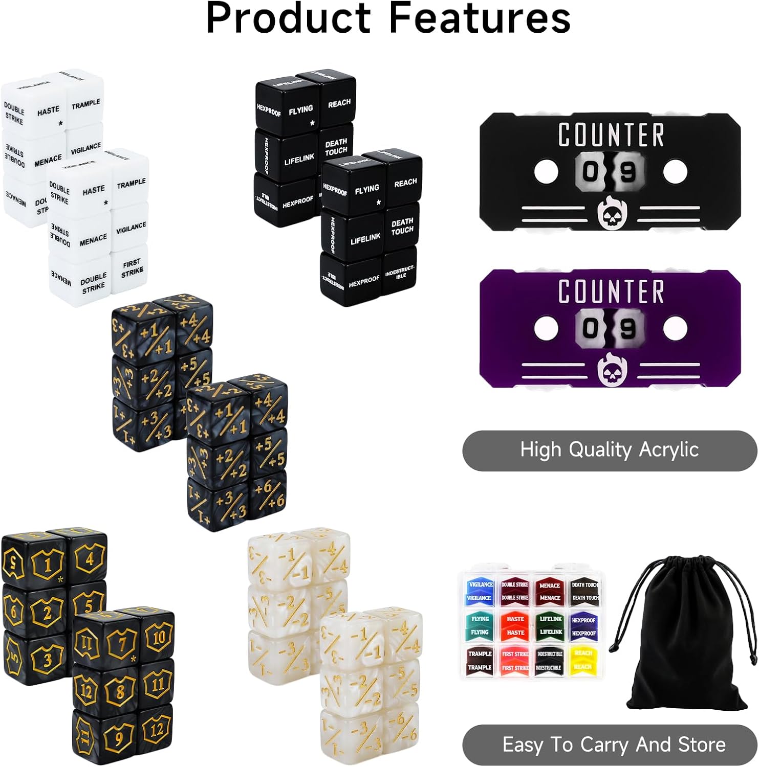 - Package Include: 6pcs 1~6 dice,6pcs 7~12 dice,12pcs white MTG keywords dice,12pcs black MTG keywords dice,12pcs-1~-6 counters & 12pcs +1~+6 counters),60PCS/BOX Mtg keywords counters( 5x Reach, 5x Lifelink, 5x Deathtouch, 5x Menace, 5x Trample, 5x Flying, 5x Vigilance, 5x First Strike, 5x Double Strike, 5x Indestructible, 5x Hexproof, 5x Haste ),2Pcs life counters