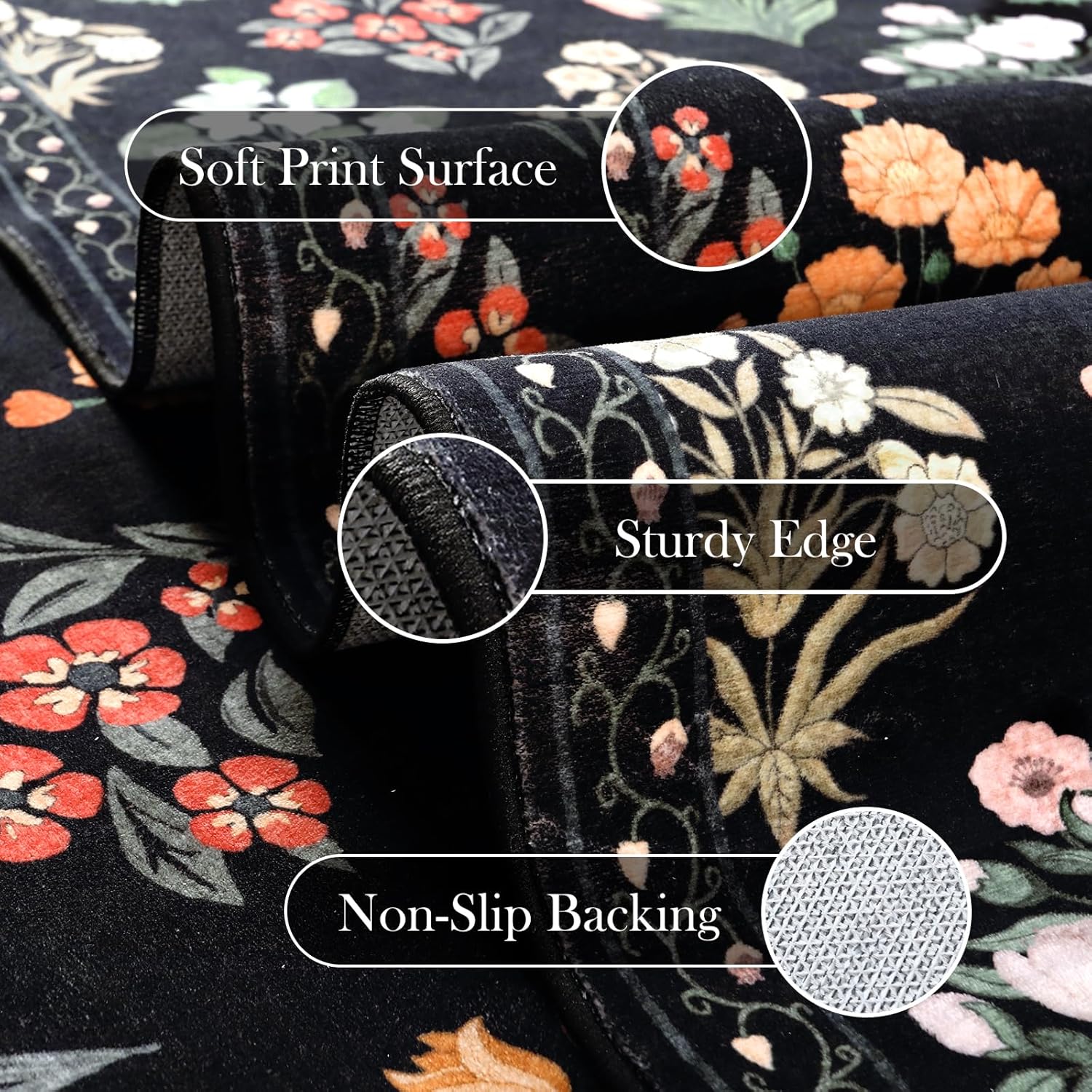 - Ultra-Thin Printed Rug: The low pile rug won't collect hair or dirt, and it can be easily washed and quick-drying. The ultra-thin design reduces tripping hazards and won’t catch under doors — blending art and peace of mind into your home