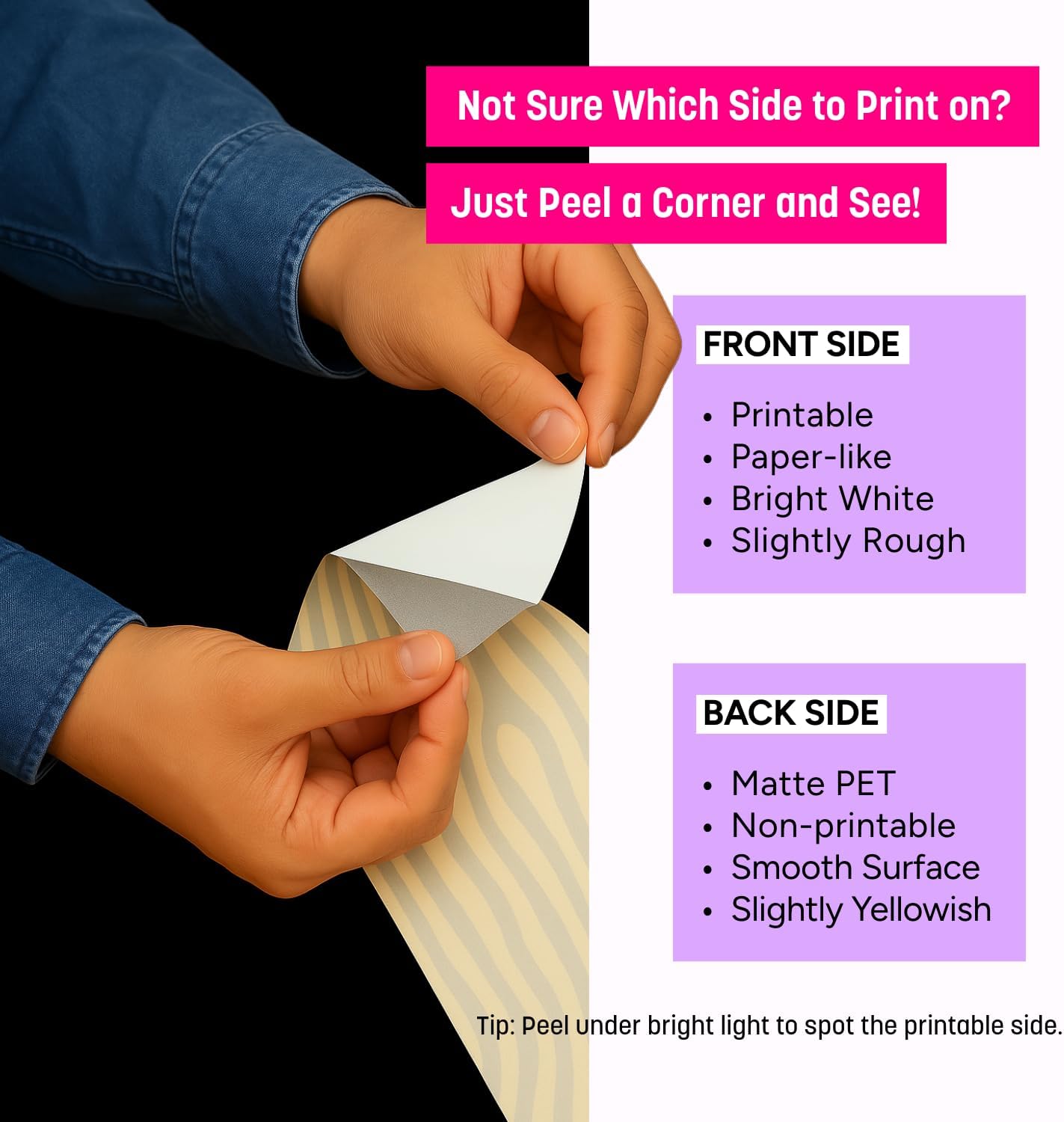 - TIP 1. CHECK SIDES: Peel a corner before printing. The bright side is the printing side, and the matte side is the backing. Printing on the backing side can cause ink to smear or drip. Please double-check before printing.