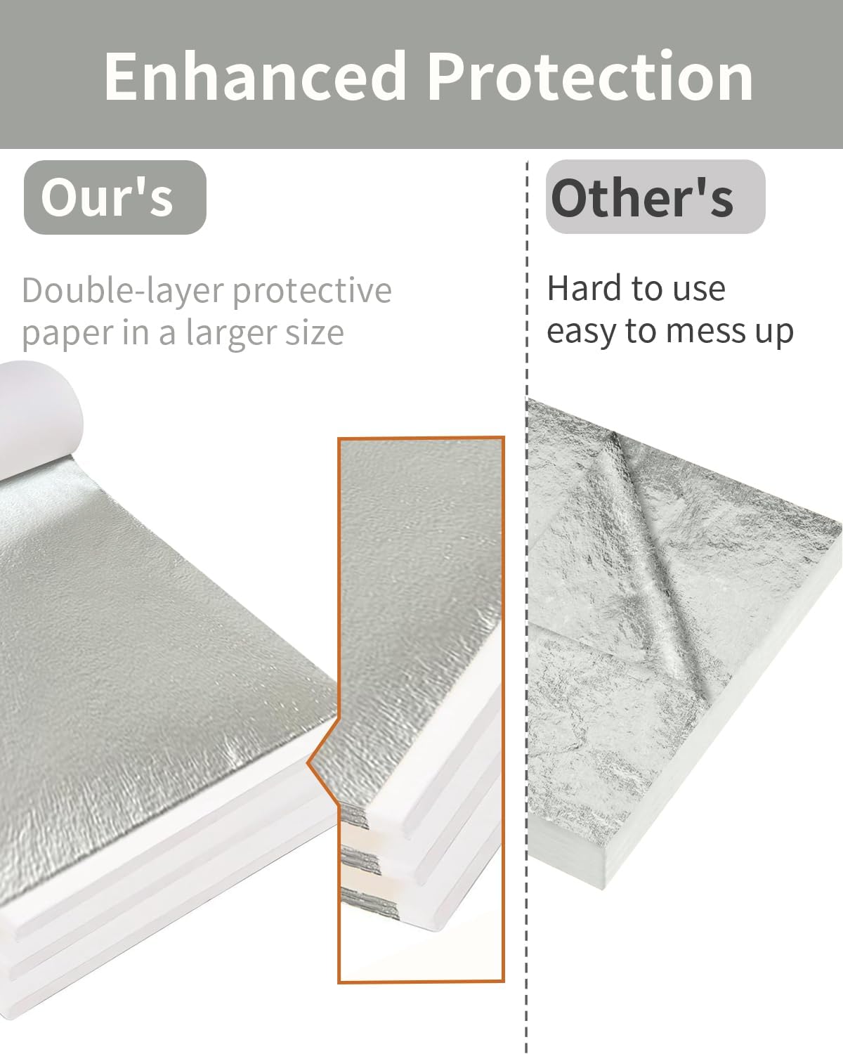 - INNOVATIVE DOUBLE PAPER PROTECTION: Unlike other brands that use just one protective sheet over their foil, ours features a unique double paper shield—layered above and below the gold sheets. This reduces waste, frustration, and protects your precious foil, enhancing efficiency during your creative process
