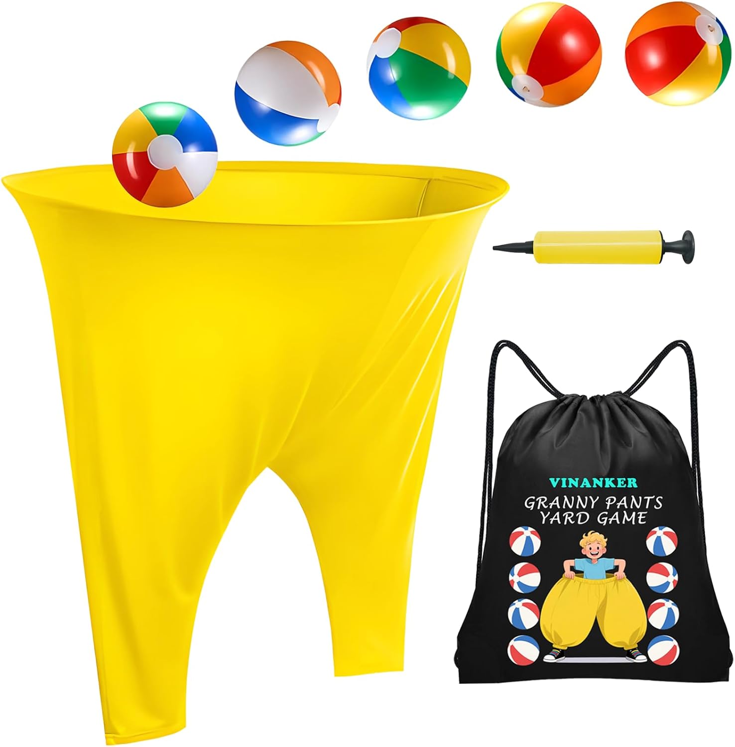 - Unleash non-stop laughter! Our Granny Pants Yard Game features giant stretchy pants and five inflatable balls for epic relay races or toss games. Perfect for adults, families, and parties – transform your backyard, park, or beach bash instantly! Durable stretchy pants handle jumps and tumbles. Includes ball, pump & drawstring backpack. Get ready for unforgettable fun!